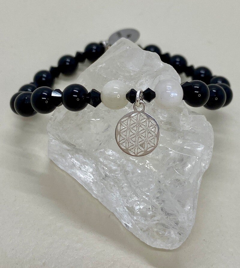 Dein Herzensbegleiter aus schwarzem Turmalin und Mondstein-Perlen (6 mm) mit der Blume des Lebens in Silberverbindet kraftvolle Erdung mit sanfter Weiblichkeit.