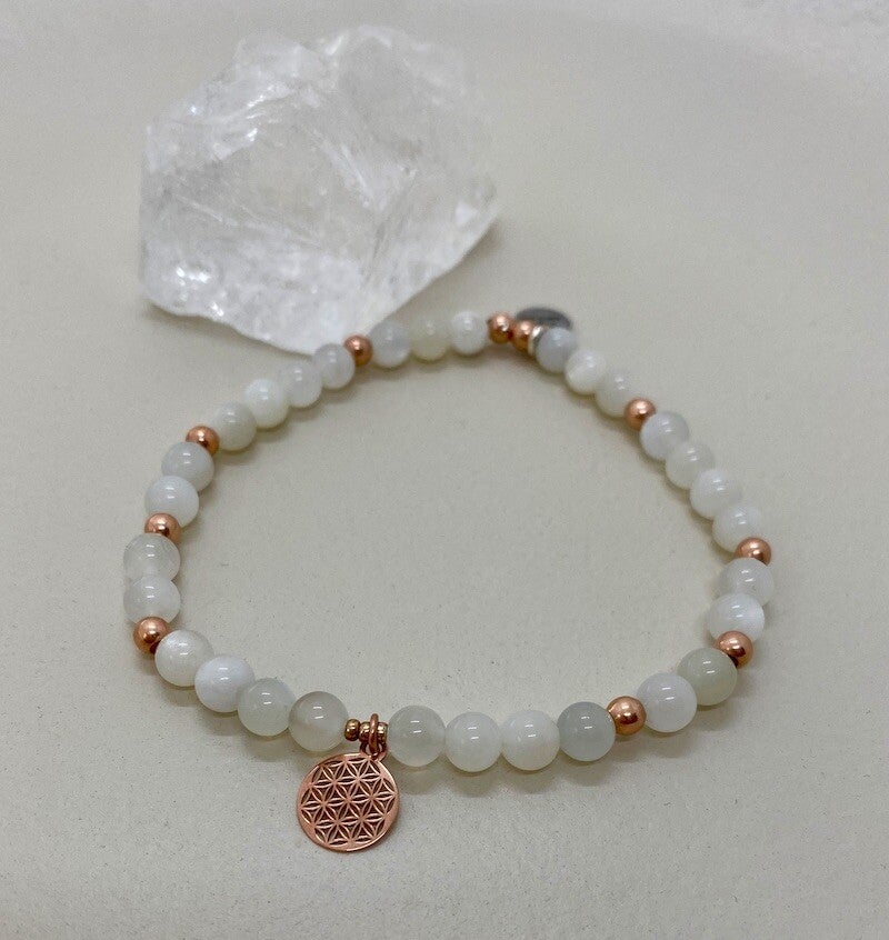 Dein Herzensbegleiter aus weißem Mondstein (6 mm) mit der Blume des Lebens in Roségold (silber vergoldet) stärkt deine Intuition und verbindet dich mit deiner weiblichen Energie.