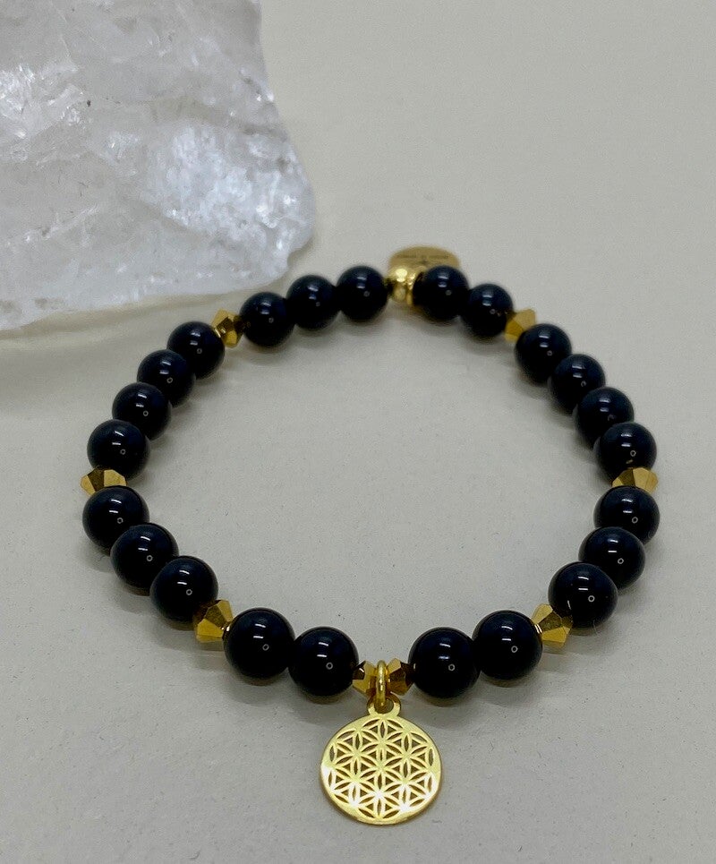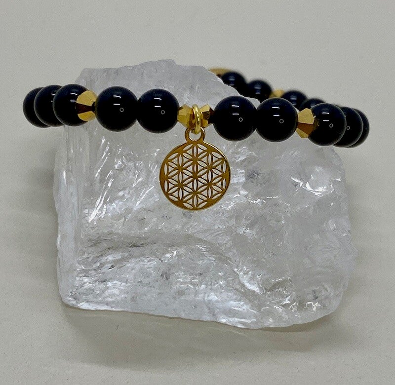 Dein Herzensbegleiter aus schwarzem Turmalin (6 mm) mit der Blume des Lebens in Gold (silber vergoldet) schenkt dir seelische Stärke, innere Ruhe und Klarheit.