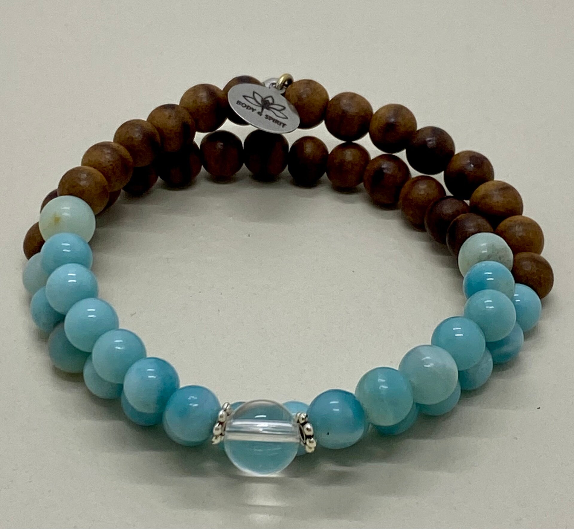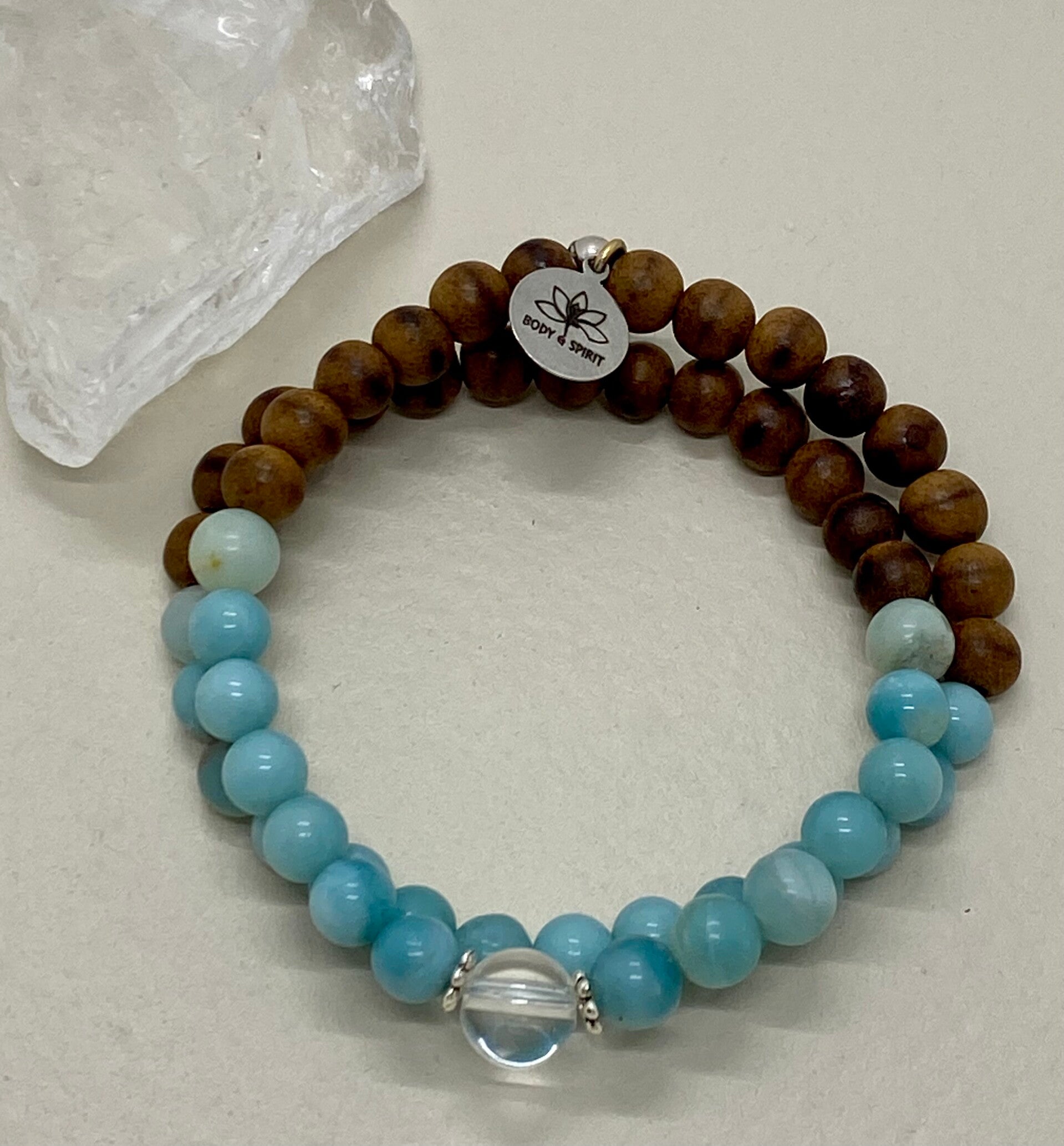 Dein Herzensbegleiter aus Amazonit und Sandelholz-Perlen (6 mm) mit einer facettierten Bergkristall-Perle (8 mm) in der Mitte schenkt dir Ruhe, Klarheit und innere Harmonie.