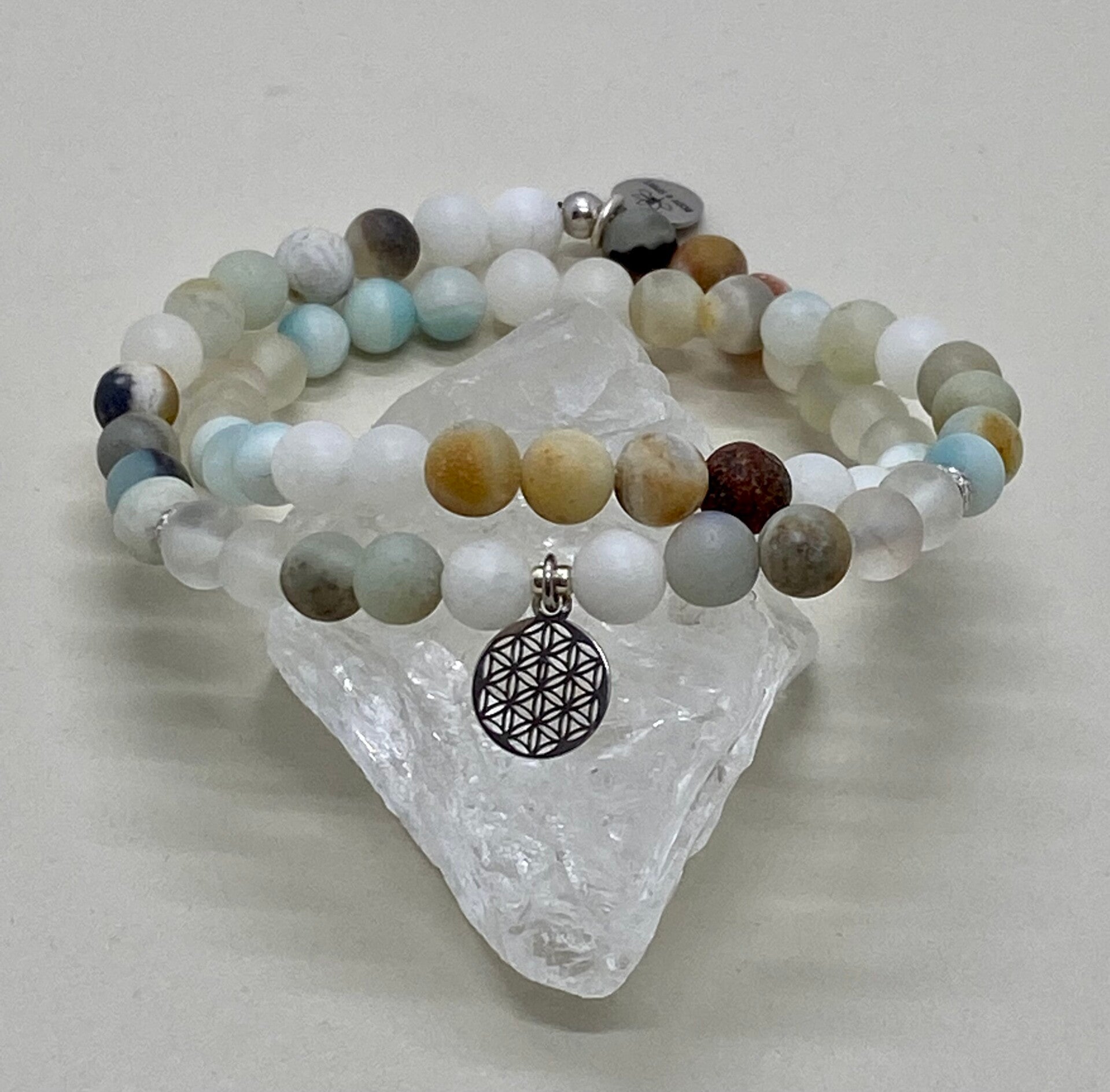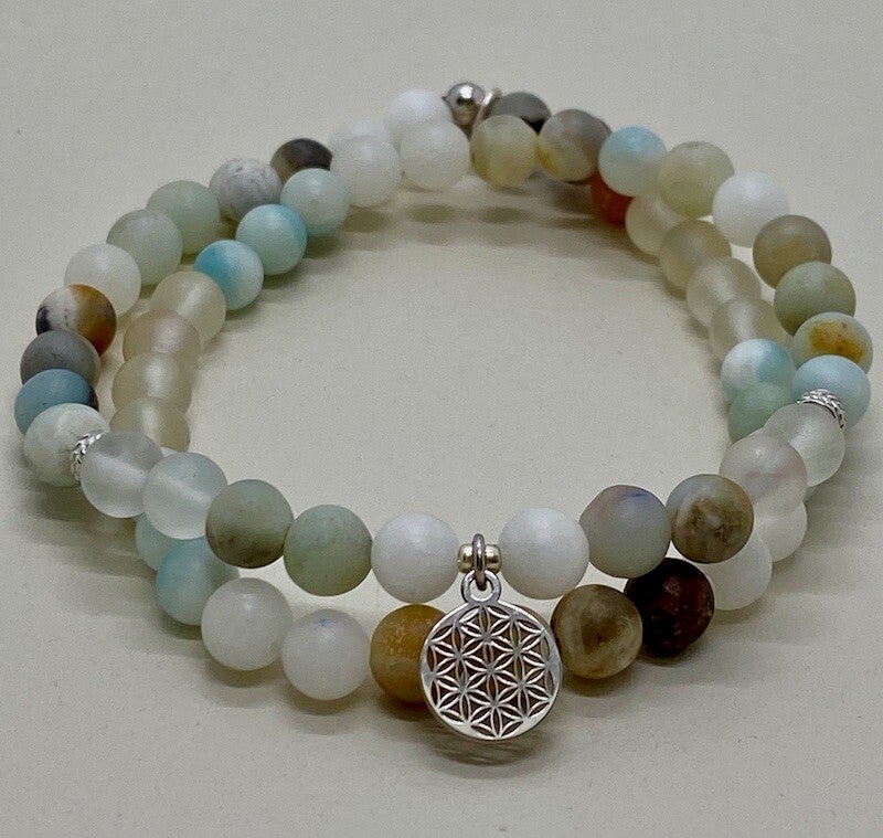 Dein Herzensbegleiter aus Amazonit-Perlen (6 mm) mit der Blume des Lebens in Silber schenkt dir Ruhe, Gelassenheit und neue Lebensfreude.