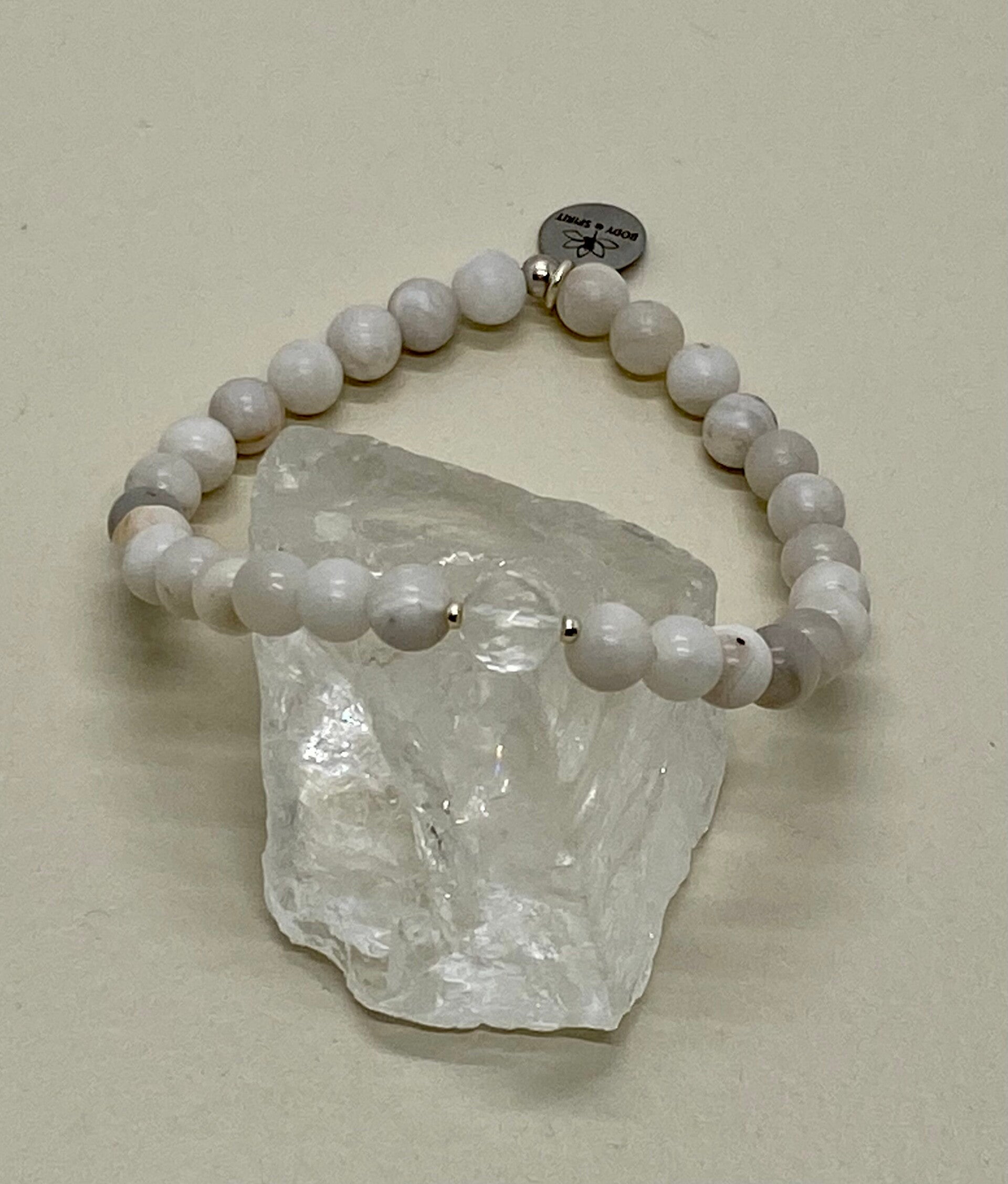 Dein Herzensbegleiter aus weißem Achat (6 mm) mit einer facettierten Bergkristall-Perle (8 mm) in der Mitte schenkt dir innere Stärke, Klarheit und Ausgeglichenheit.