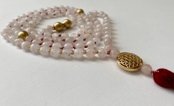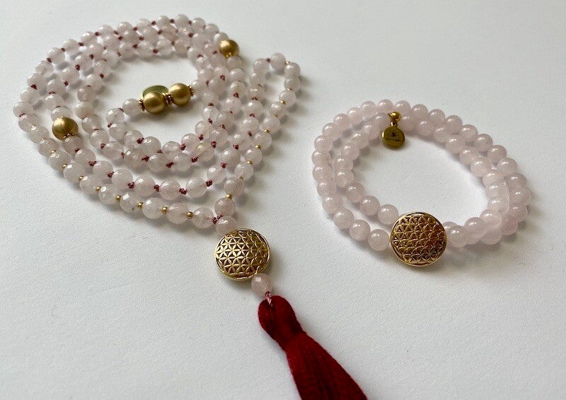 Deine Rosenquarz-Mala (6 mm) mit der Blume des Lebens in Gold (silbervergoldet) und feinen vergoldeten Silberperlen erinnert dich an das, was du längst bist – Liebe in Bewegung.
