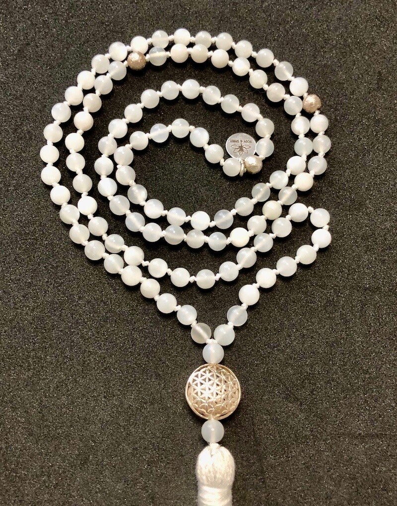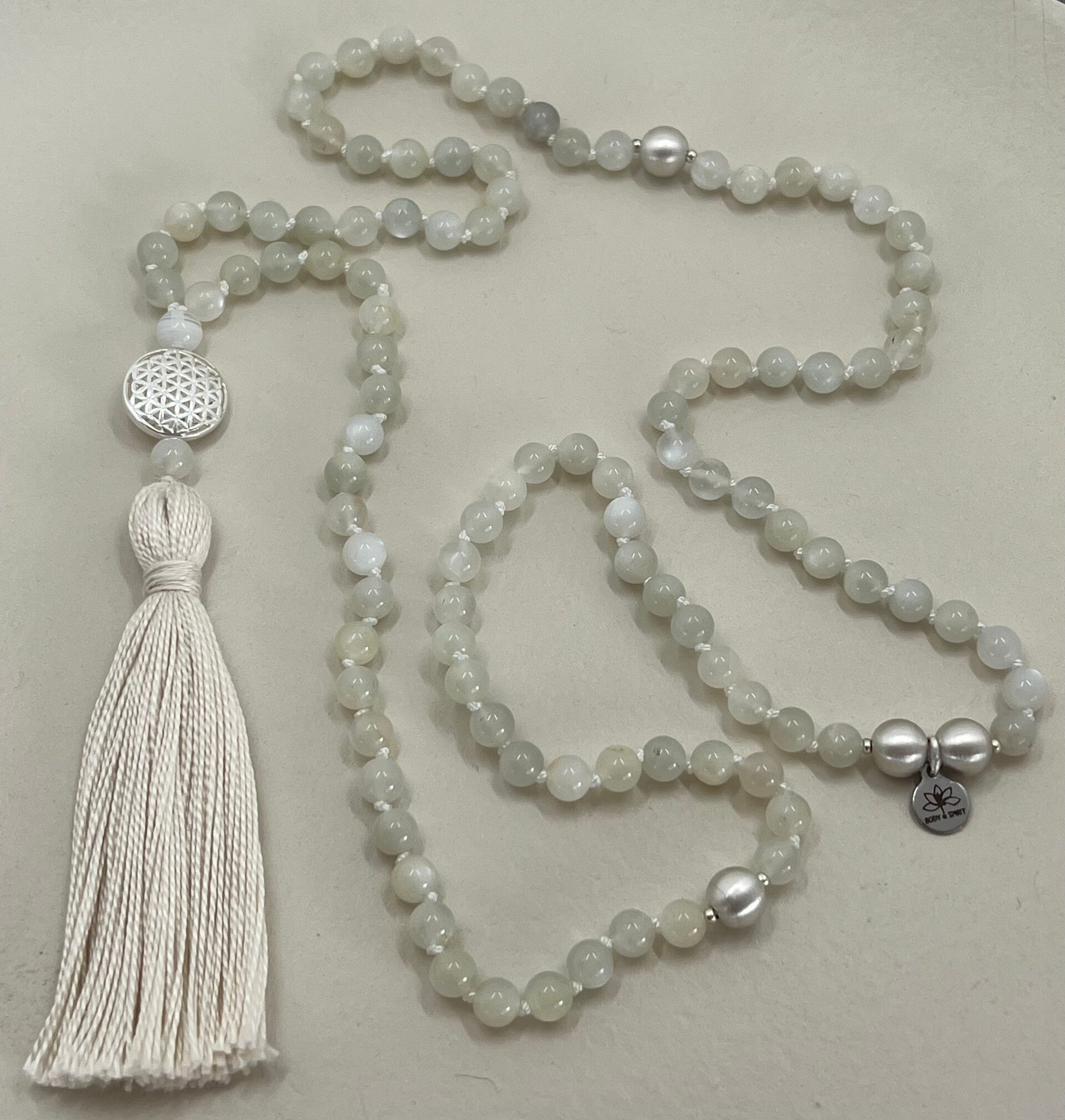 Die Blume des Lebens ist wahlweise in Silber oder Gold erhältlich (siehe Bild). Passend zu dieser Mala findest du im Shop das harmonische Mondstein-Armband.