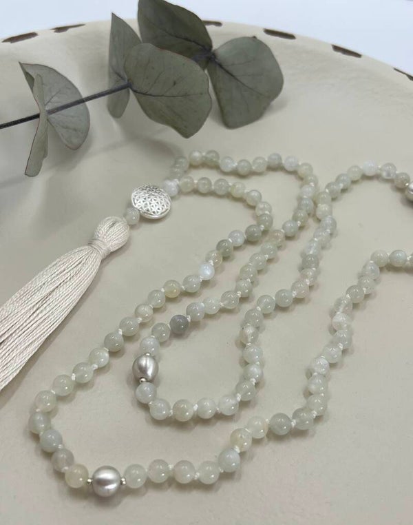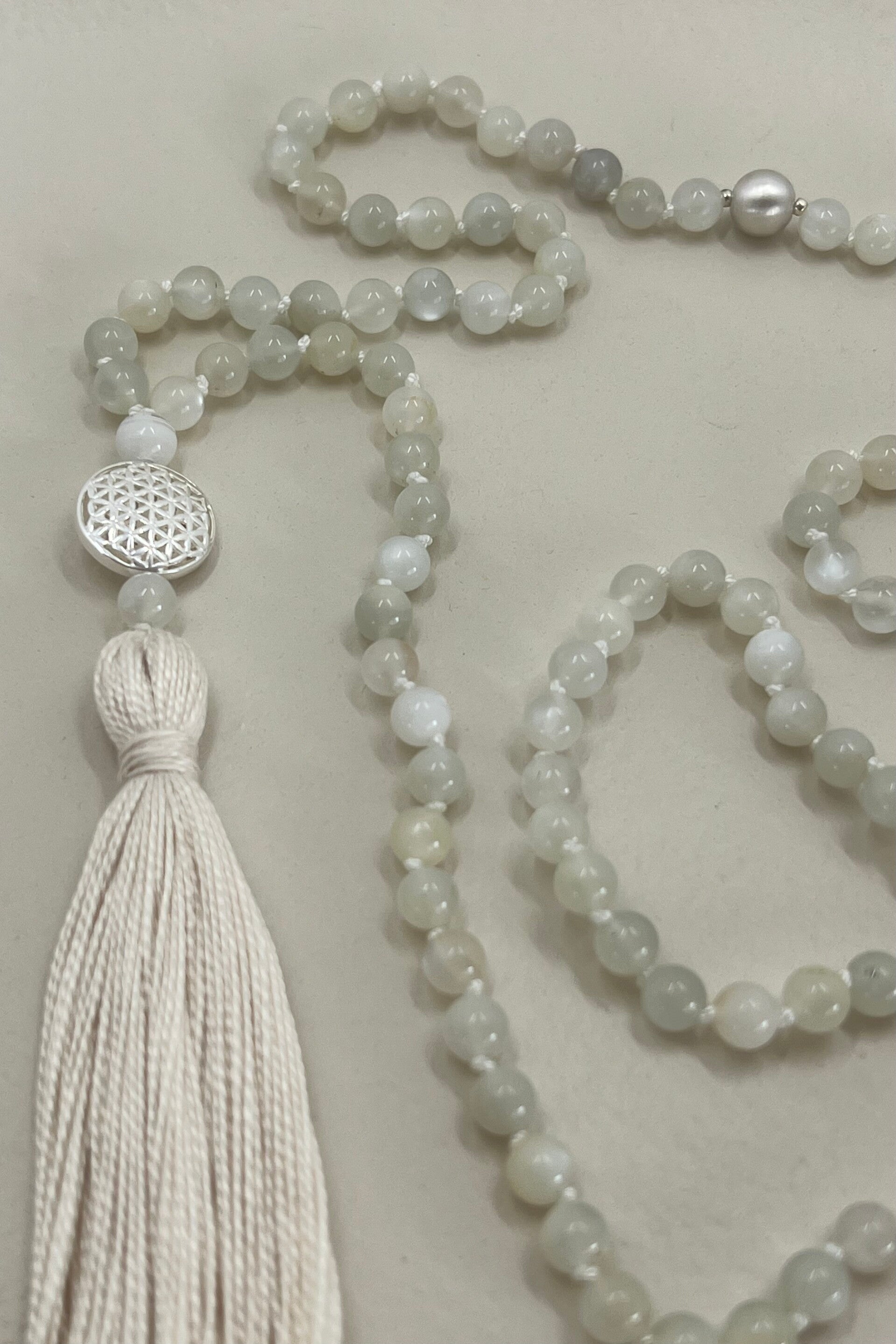Jede Mala wird liebevoll von Hand geknüpft. Sie besteht aus 108 echten Edelsteinperlen (6 mm) und vier Silberperlen (8 mm). Die Guruperle in Form der Blume des Lebens aus Sterling Silber verstärkt die Wirkung des Mondsteins und verbindet dich mit göttlicher Harmonie und Schutz.