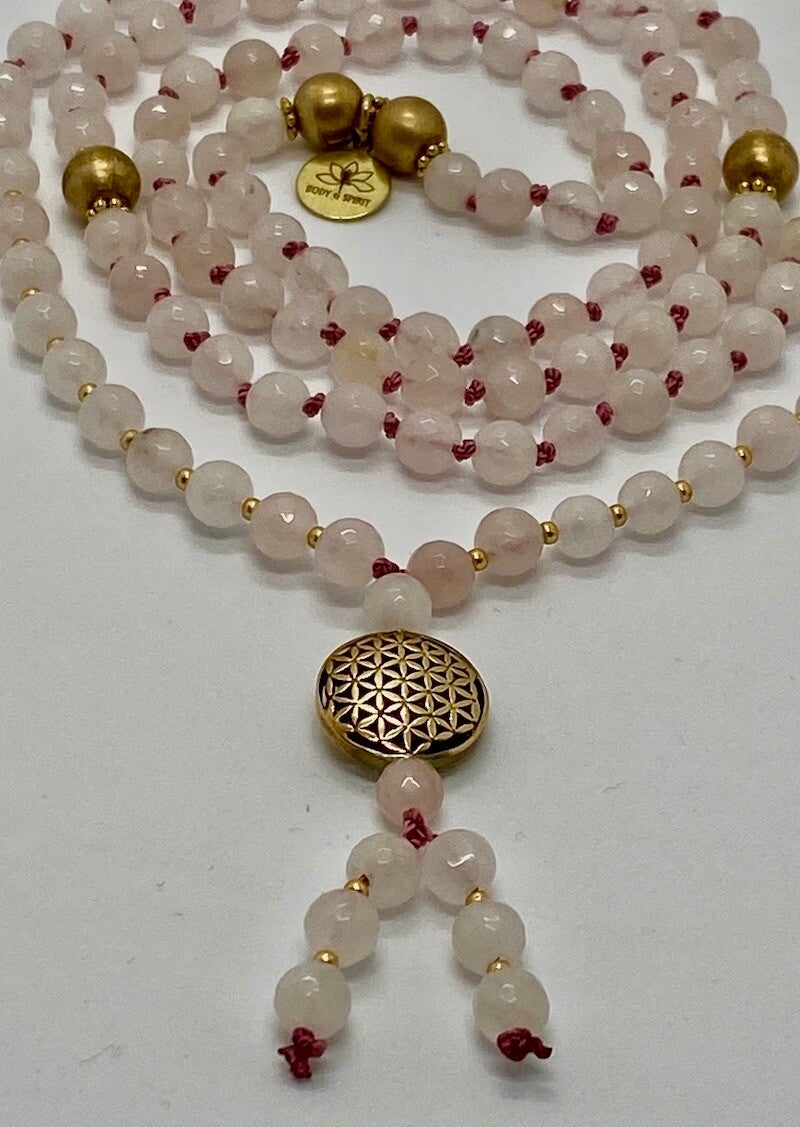 Jede Mala wird mit Achtsamkeit und Hingabe von Hand geknüpft. Sie besteht aus 108 Edelsteinperlen (6 mm) und vier vergoldeten Silberperlen (8 mm). Die Guruperle in Form der Blume des Lebens verstärkt die harmonische Energie des Rosenquarz und verbindet dich mit göttlicher Liebe und Schutz.
