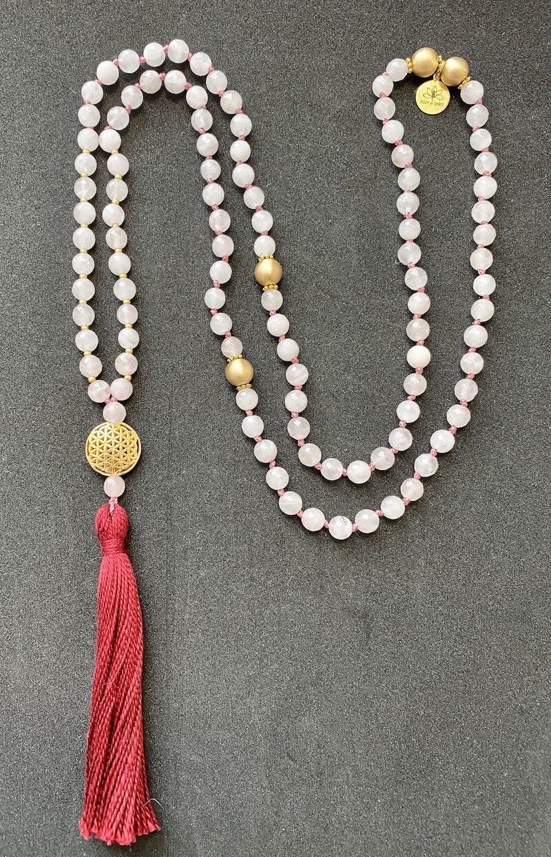 Jede Mala wird von mir liebevoll handgeknüpft. Sie besteht aus 108 Rosenquarz-Perlen (6 mm) und vier vergoldeten Silberperlen (8 mm).