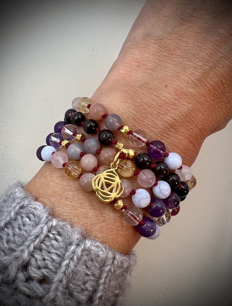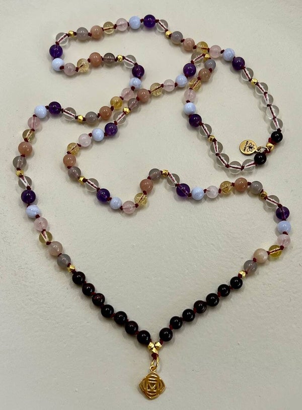 Jede dieser Malas wird von mir liebevoll von Hand geknüpft. Sie besteht aus 108 Edelsteinperlen (6 mm) – mit Granatperlen am unteren Ende und im Nackenbereich – sowie eingearbeiteten 7 Chakren-Steinen (Achat, Mondstein, Citrin, Rosenquarz, Chalcedon, Amethyst und Bergkristall), um alle Energiezentren sanft auszugleichen.