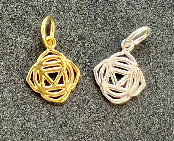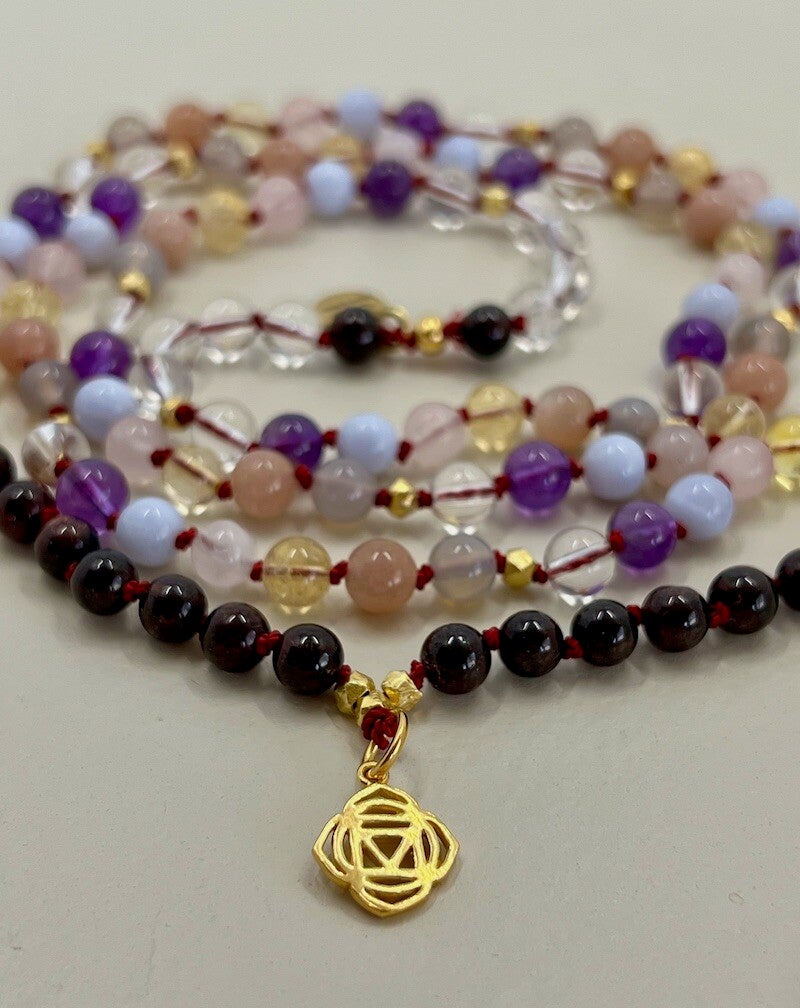Ein feiner Sterling-Silber- oder vergoldeter Chakra-Anhänger bildet das Zentrum dieser Mala und erinnert dich an die Verbundenheit mit deiner Wurzel und dem Fluss des Lebens.