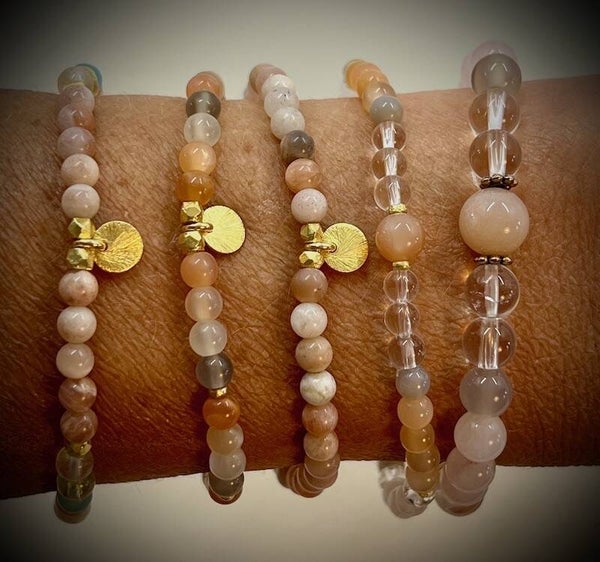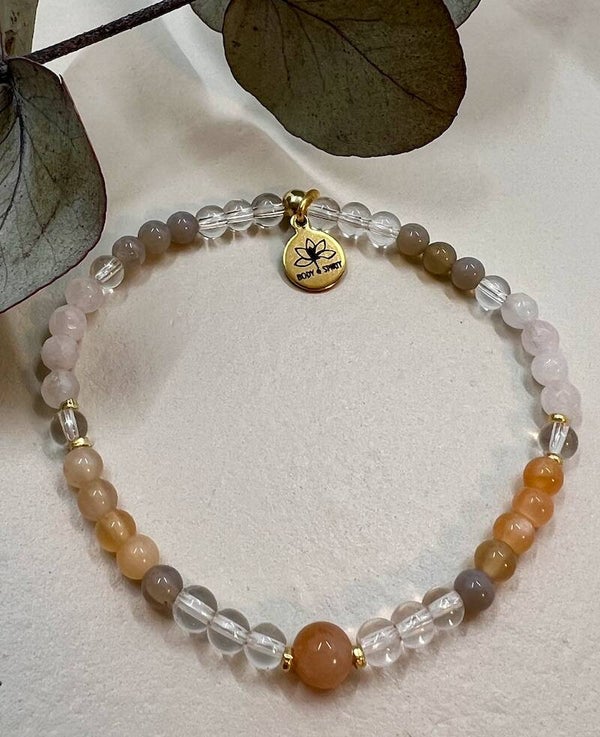 Der Rosenquarz öffnet dich für Selbstliebe und Mitgefühl, der Mondstein stärkt deine Weiblichkeit und Intuition, der Bergkristall bringt Klarheit und Harmonie, während der Achat Ruhe und Stabilität schenkt.