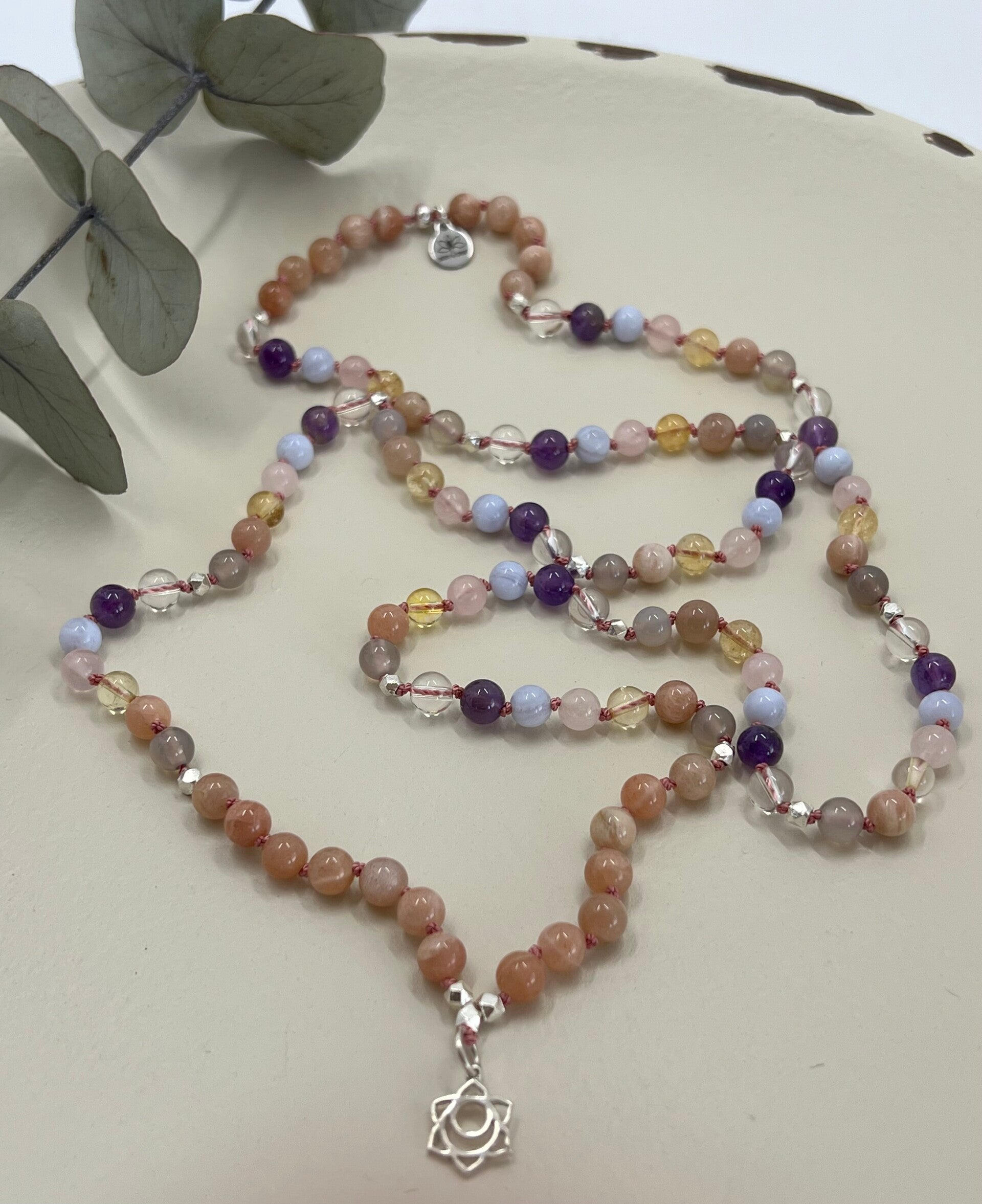 Jede Mala wird von mir achtsam handgeknüpft und besteht aus 108 Edelsteinperlen (6 mm). Den Abschluss bildet eine handgearbeitete Quaste, die den tausendblättrigen Lotus symbolisiert – das Zeichen für Erblühen, Schöpfung und Hingabe.