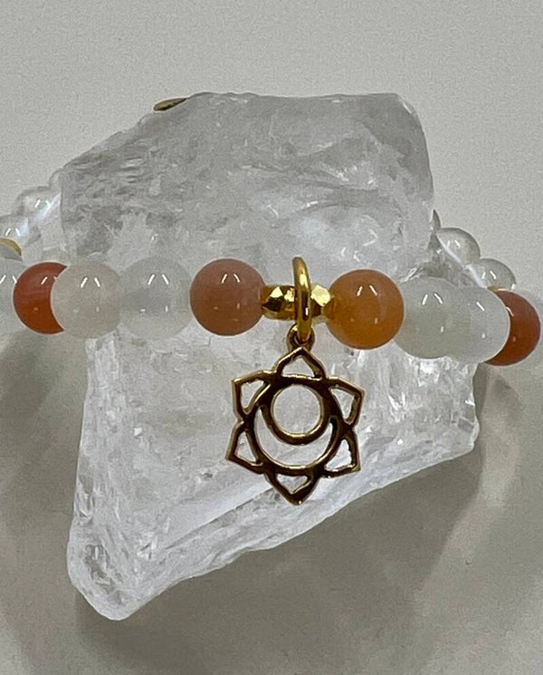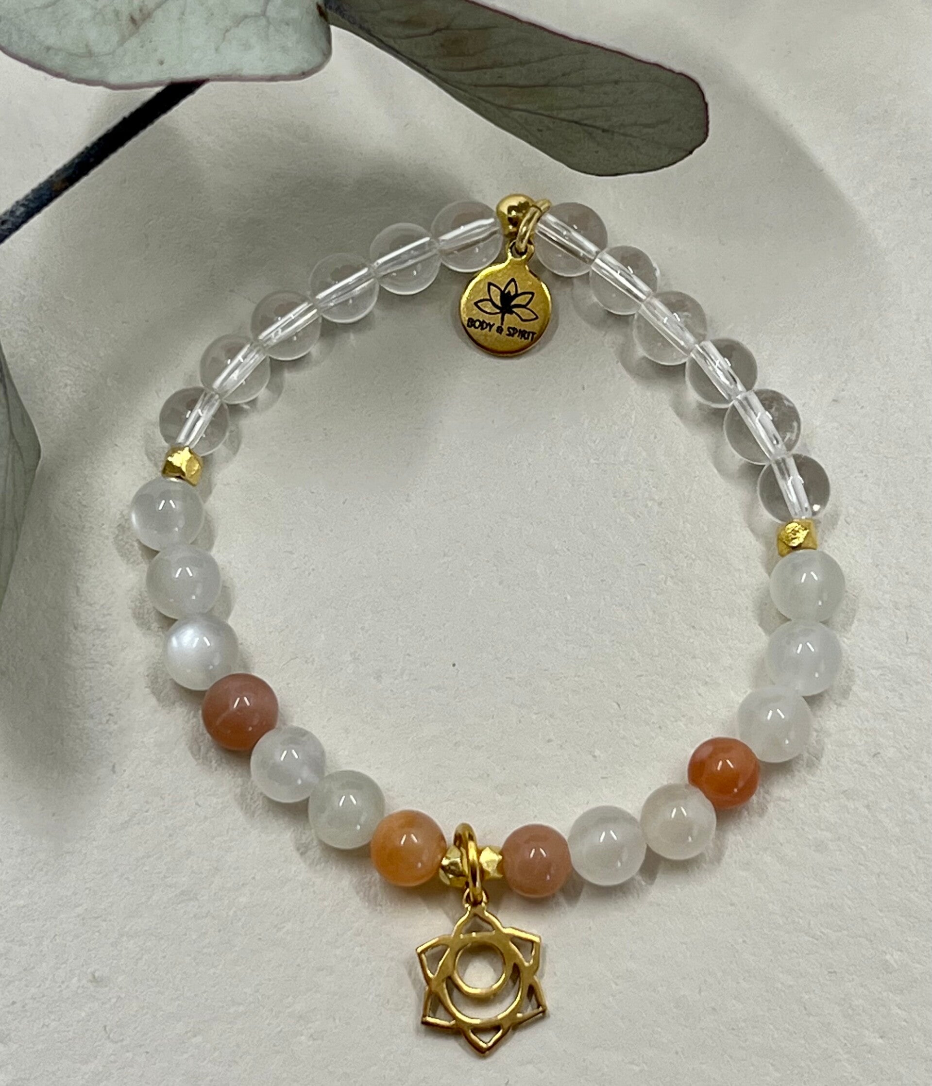 Dein Herzensbegleiter für das Sakralchakra (2. Chakra) aus orangefarbenem und weißem Mondstein sowie Bergkristall (6 mm) weckt deine kreative Energie und schenkt dir Lebensfreude und Sinnlichkeit.
