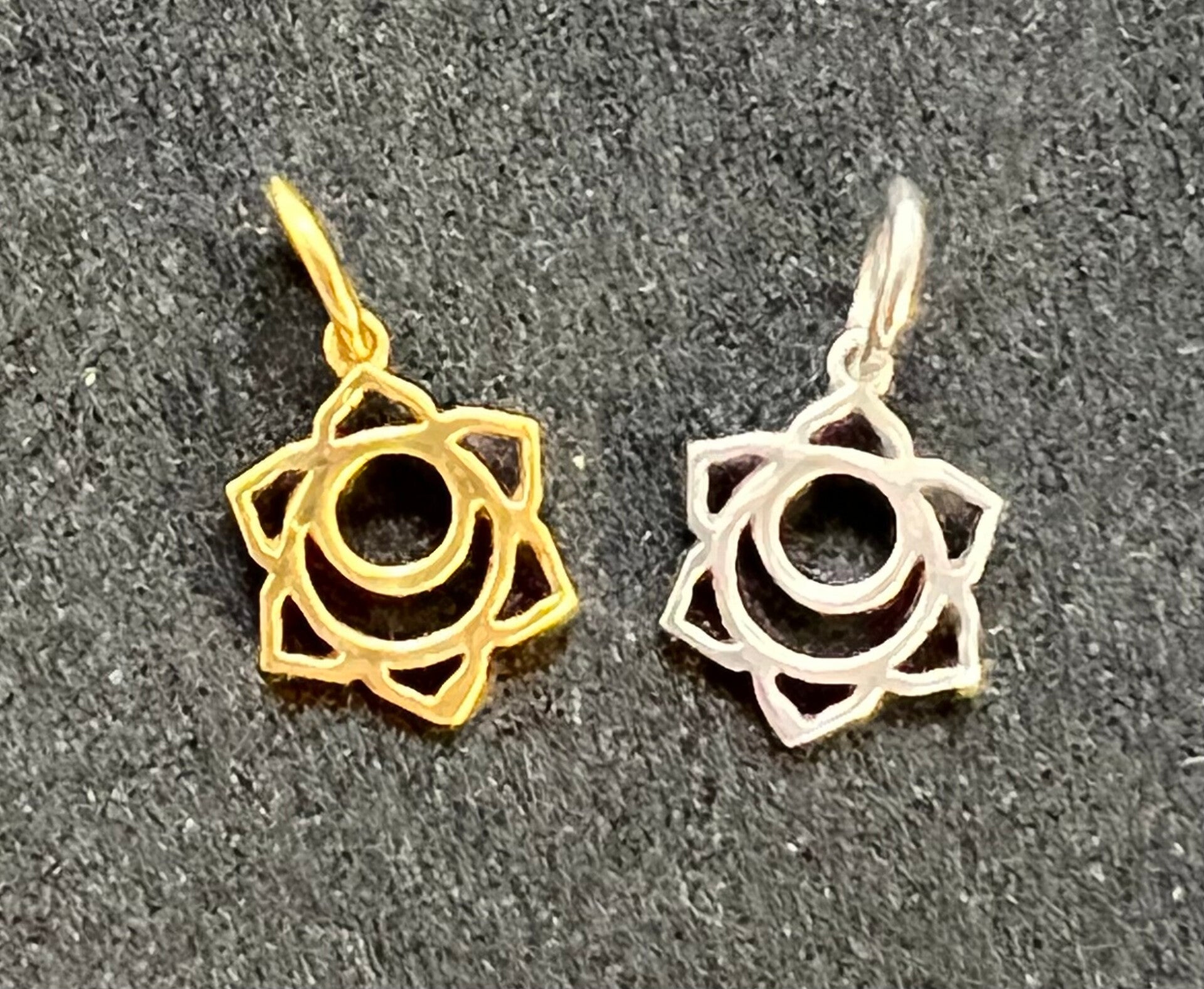 Der Chakra-Anhänger ist wahlweise in Sterling Silber oder Sterling Silber vergoldet erhältlich.