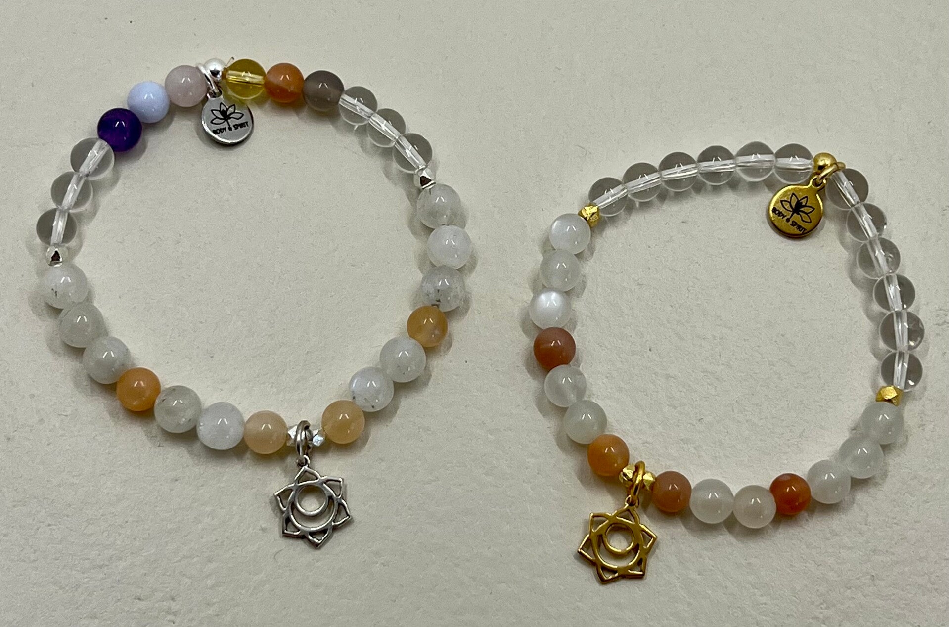 Auf Wunsch kannst du das Armband mit den 7 Chakra-Steinen (Achat, Mondstein, Citrin, Rosenquarz, Chalcedon, Amethyst und Bergkristall) oder in einer reinen Variante mit Bergkristall erhalten.