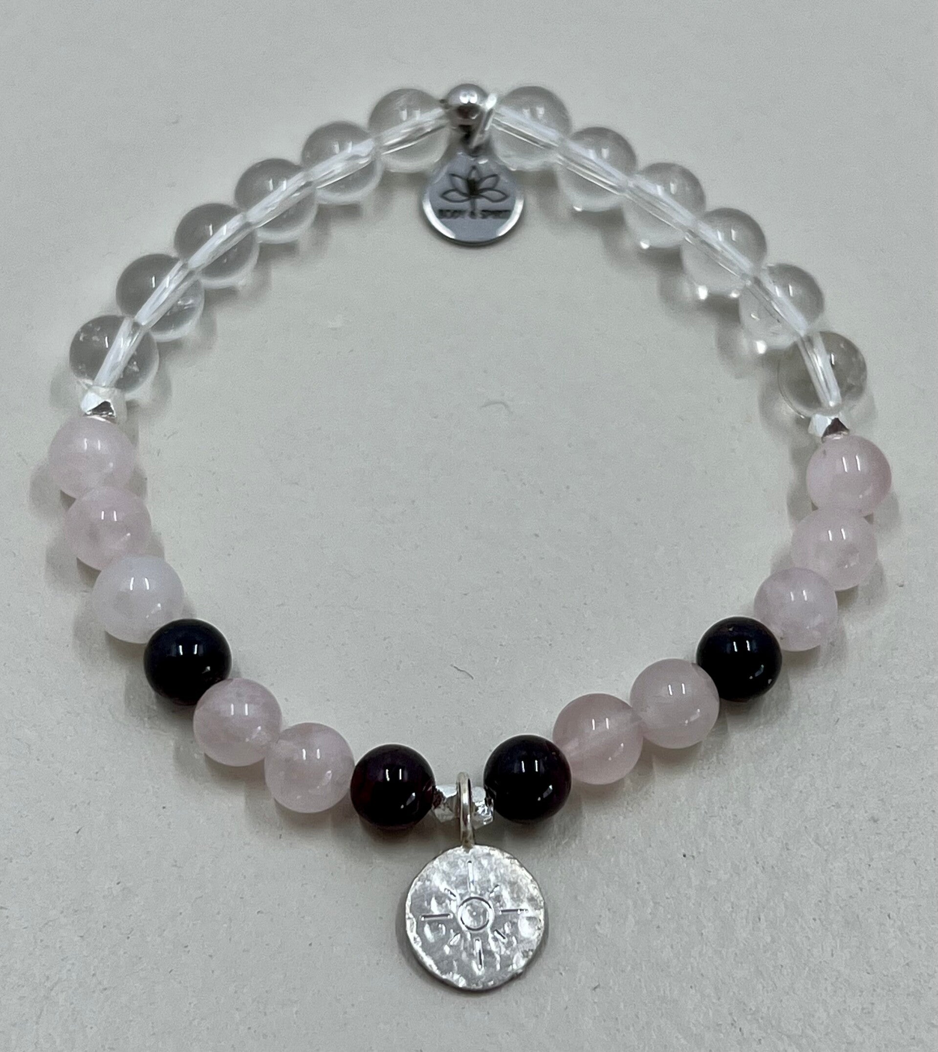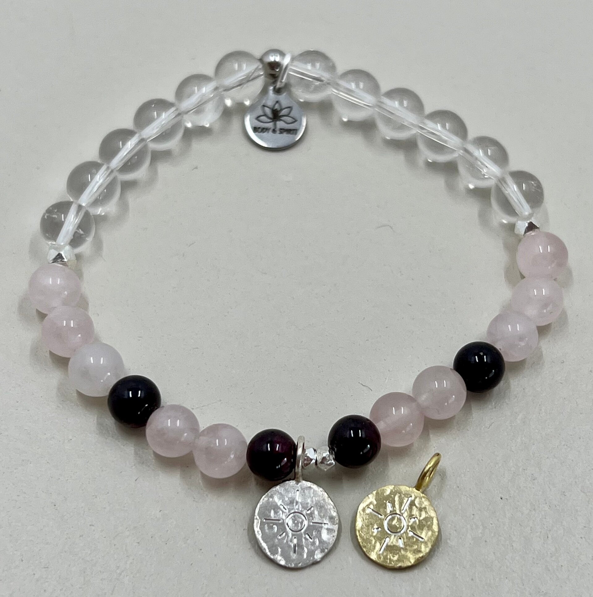 Dein Herzensbegleiter Armband -aus Rosenquarz, Granat und Bergkristall Perlen mit dem wundervollen LOVE Anänger von der lieben Janine Lorang in Silber ; 6mm Edelsteinperlen