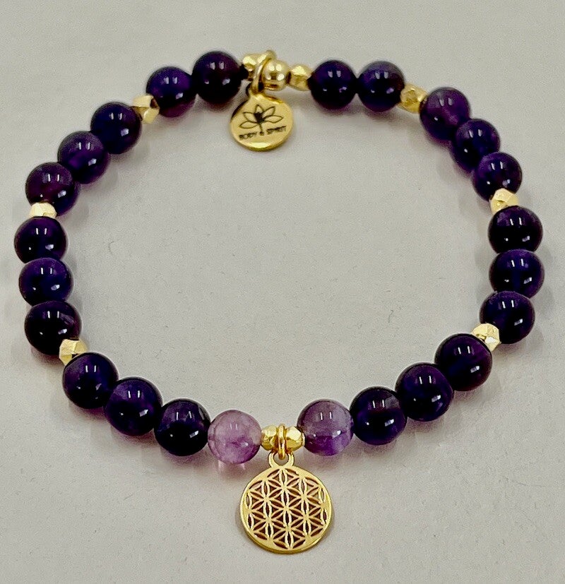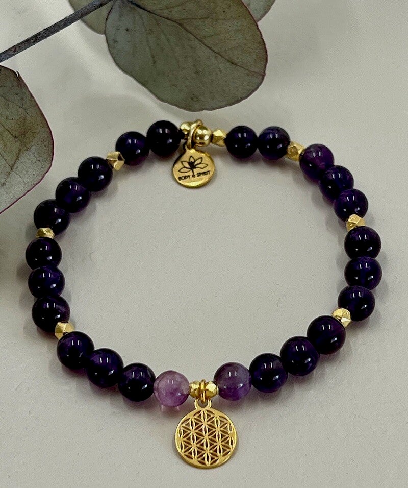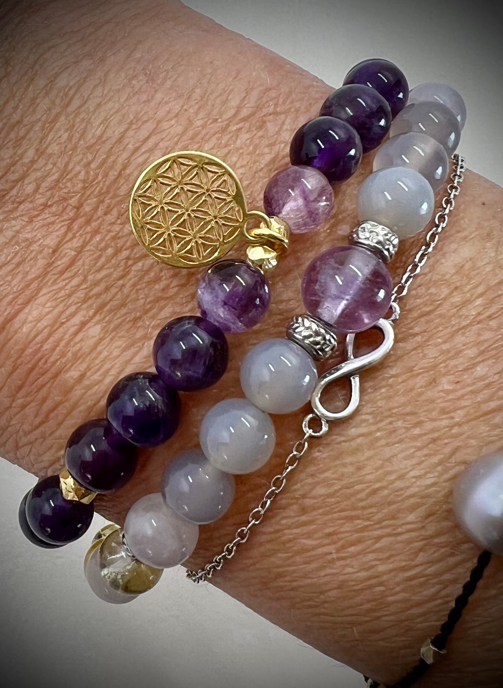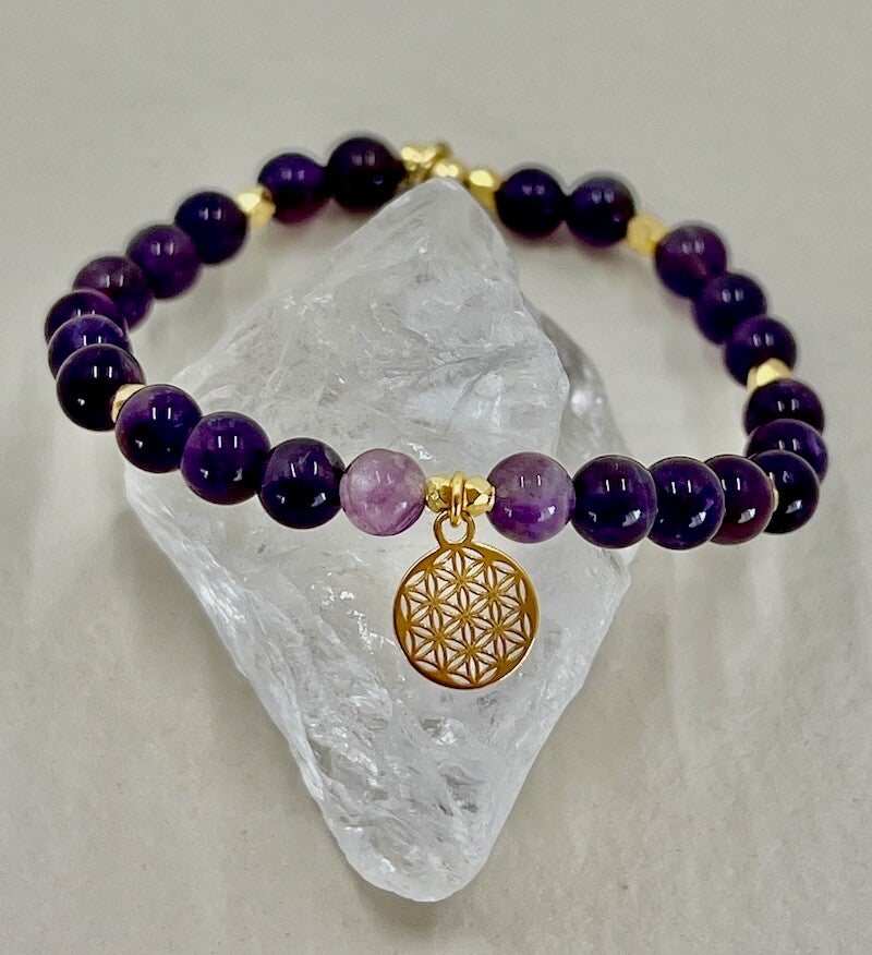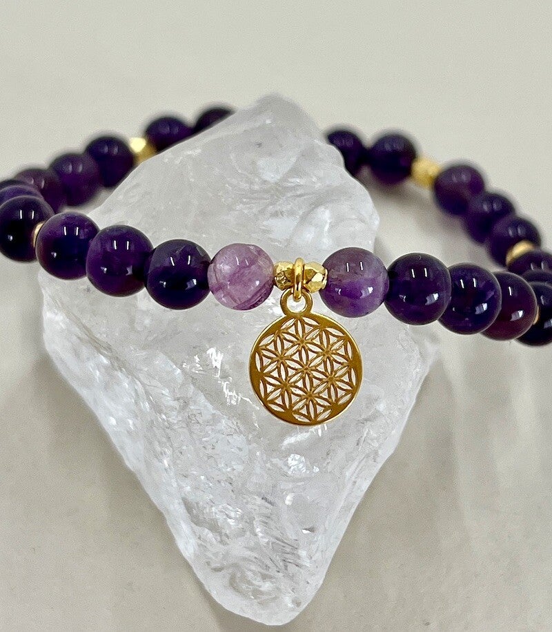 Dein Herzensbegleiter aus Amethyst (6 mm) mit der Blume des Lebens in Roségold (silber vergoldet) schenkt dir tiefe innere Ruhe und geistige Klarheit.