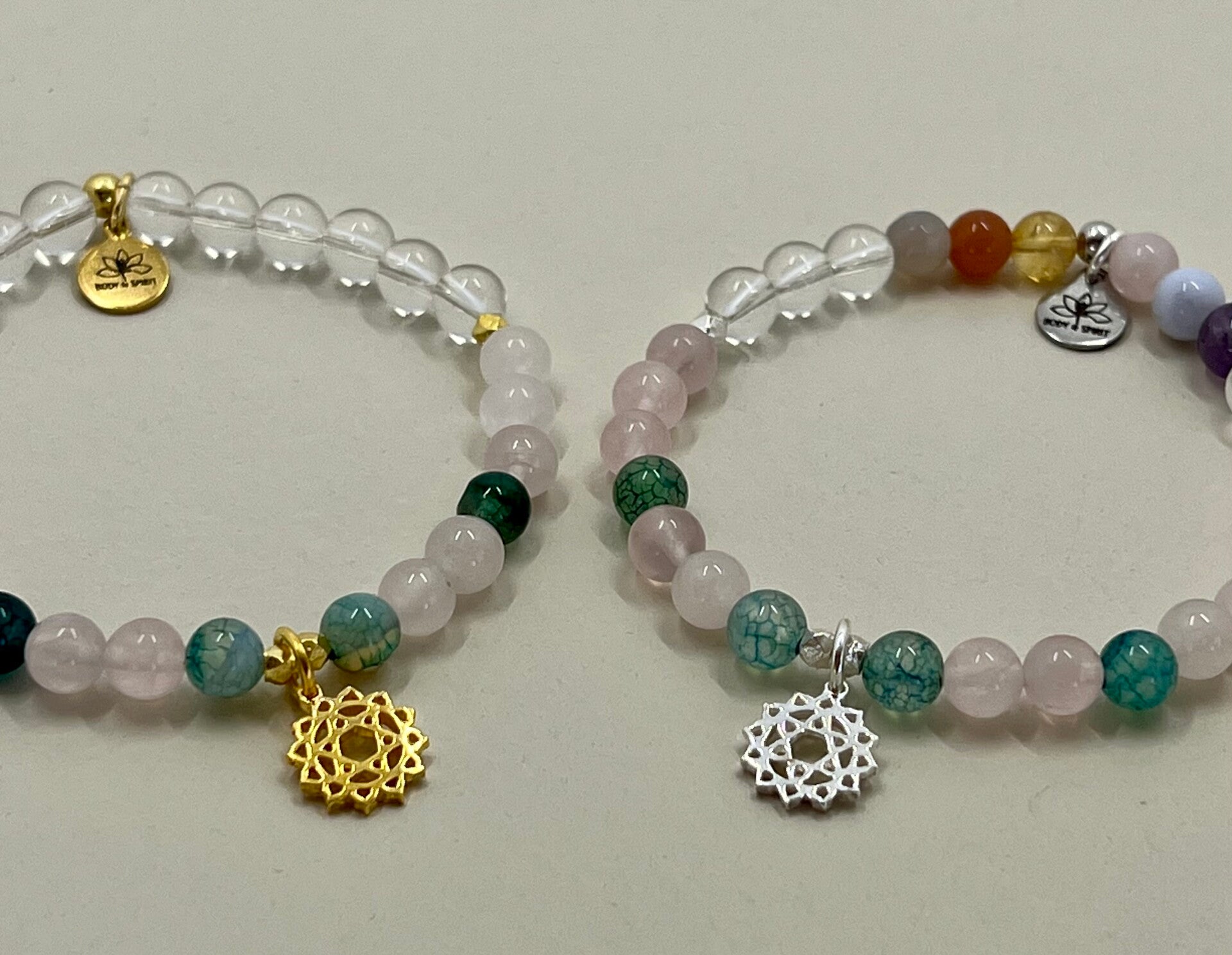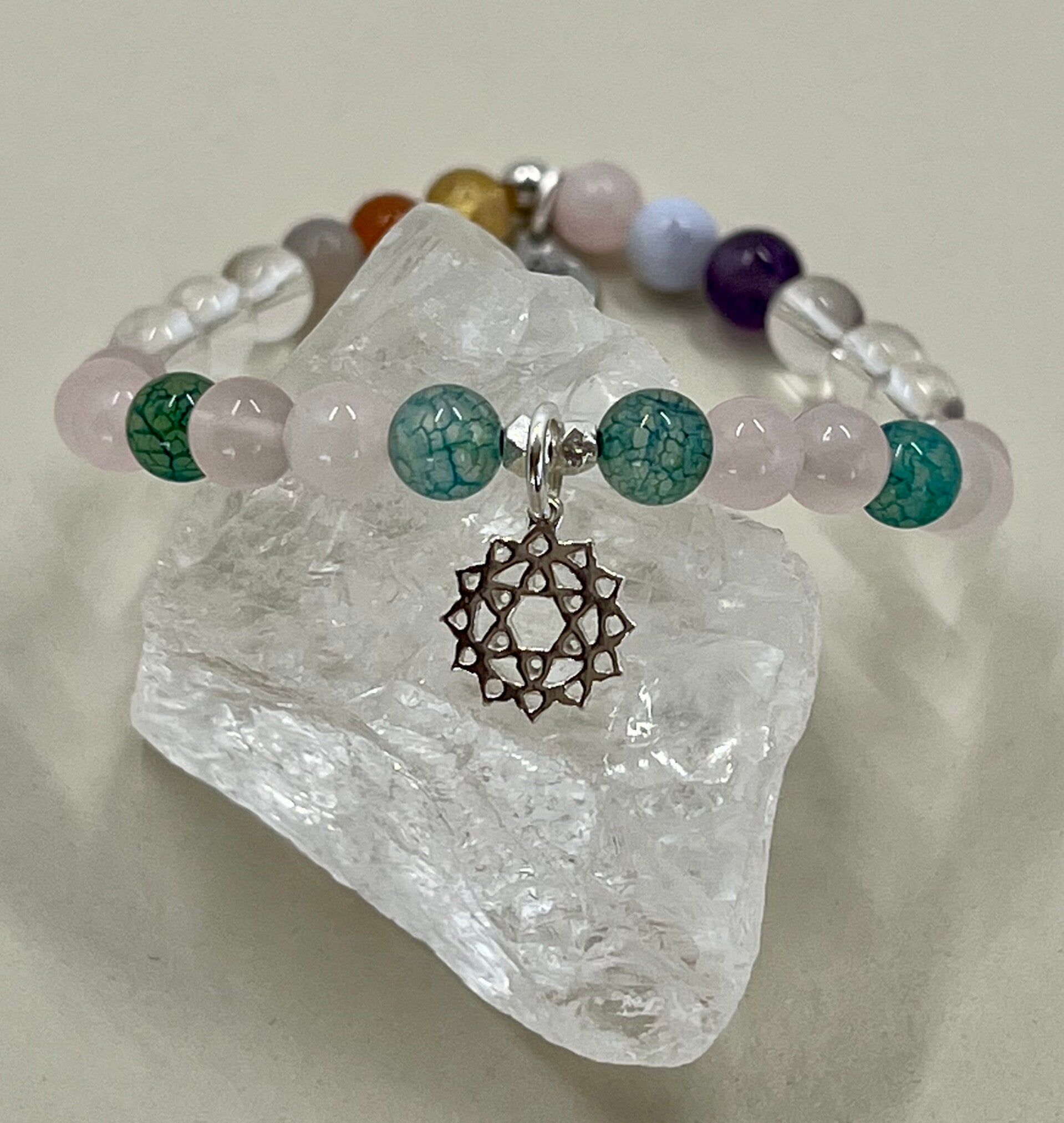 Auf Wunsch kannst du das Armband mit den 7 Chakra-Steinen (Achat, Mondstein, Citrin, Rosenquarz, Chalcedon, Amethyst und Bergkristall) oder in einer reinen Variante mit Bergkristall erhalten.