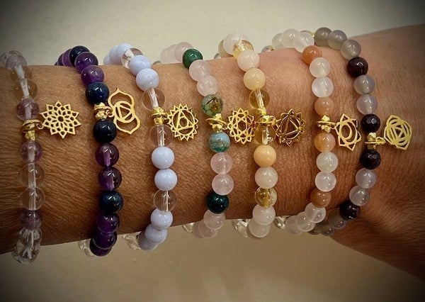Auf Wunsch kannst du das Armband mit den 7 Chakra-Steinen (Achat, Mondstein, Citrin, Rosenquarz, Chalcedon, Amethyst und Bergkristall) oder in einer reinen Variante mit Bergkristall erhalten.
